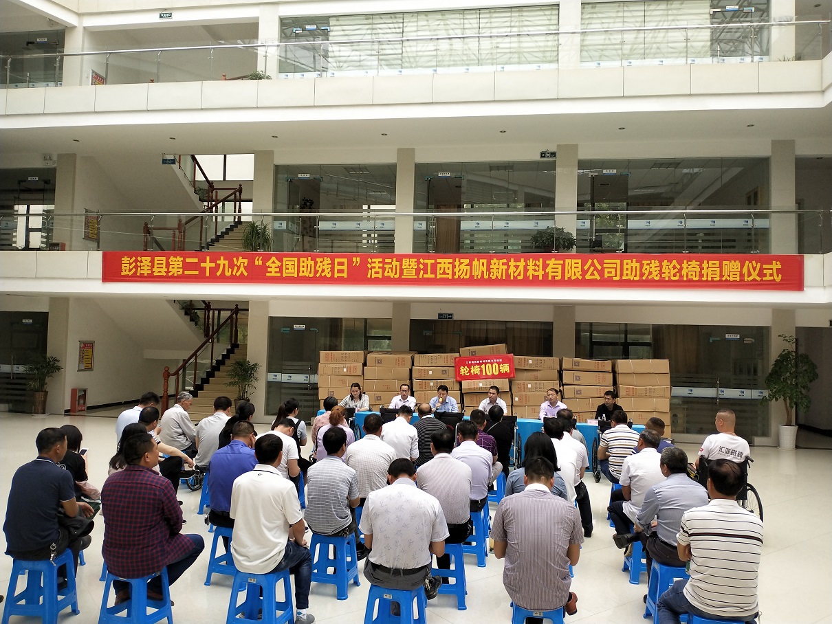 5月17日上午十點(diǎn)半,彭澤縣第二十九次“全國助殘日”活動(dòng)暨江西揚(yáng)帆新材料有限公司助殘輪椅捐贈(zèng)儀式在公司辦公樓大廳如期舉行,彭澤縣政協(xié)張仁初主任、彭澤縣殘聯(lián)宗翔理事長、各鄉(xiāng)鎮(zhèn)殘聯(lián)理事長、公司總經(jīng)理陳育亮、常務(wù)副總余立志及部分殘疾人代表參加了此次捐贈(zèng)儀式。