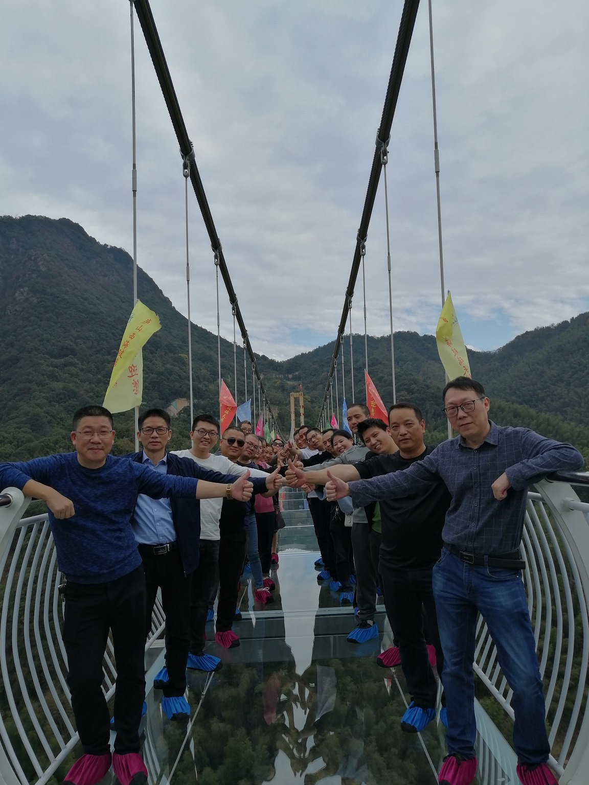 16日一早陽光明媚,在一路的歡歌笑語中,大家首先來到了“人在橋上走,景在底下游”的廬山西海9D玻璃橋。 此橋凌駕于峰巒疊嶂的兩山之間,全程用透明玻璃構(gòu)成,全長398米最高落差108米寬2米,遠(yuǎn)遠(yuǎn)望之仿佛隱形于叢林之中,站在玻璃天橋上有步入云端的感覺,玻璃橋中段還有震撼9D效果,輕輕一踩玻璃便在腳下爆碎蔓延,逼真刺激的破碎聲音咔咔咔地在耳邊響起。這使得團(tuán)隊(duì)里多名恐高隊(duì)友,一開始都覺得這是不可能跨越的鴻溝,紛紛打起退堂鼓。但在同事們的再三鼓勵(lì)下,最終克服恐懼,戰(zhàn)勝自己!通過玻璃棧道后大家回程嘗試了廬山西海9D玻璃滑道,全長518米的雙道雙滑玻璃滑道,不僅周圍風(fēng)光一覽無余,更切實(shí)感受了一把速度與激情。