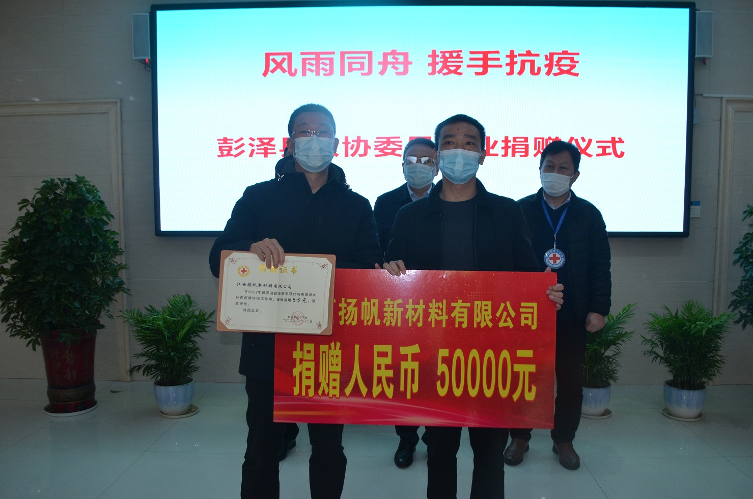 3月22日,江西揚帆在彭澤縣政協(xié)牽頭組織的“風(fēng)雨同舟、援手抗疫”捐贈儀式上,向彭澤縣防疫指揮部捐贈抗疫資金5萬元,以實際行動表達(dá)了企業(yè)同心協(xié)力抗擊疫情的責(zé)任和當(dāng)擔(dān)。