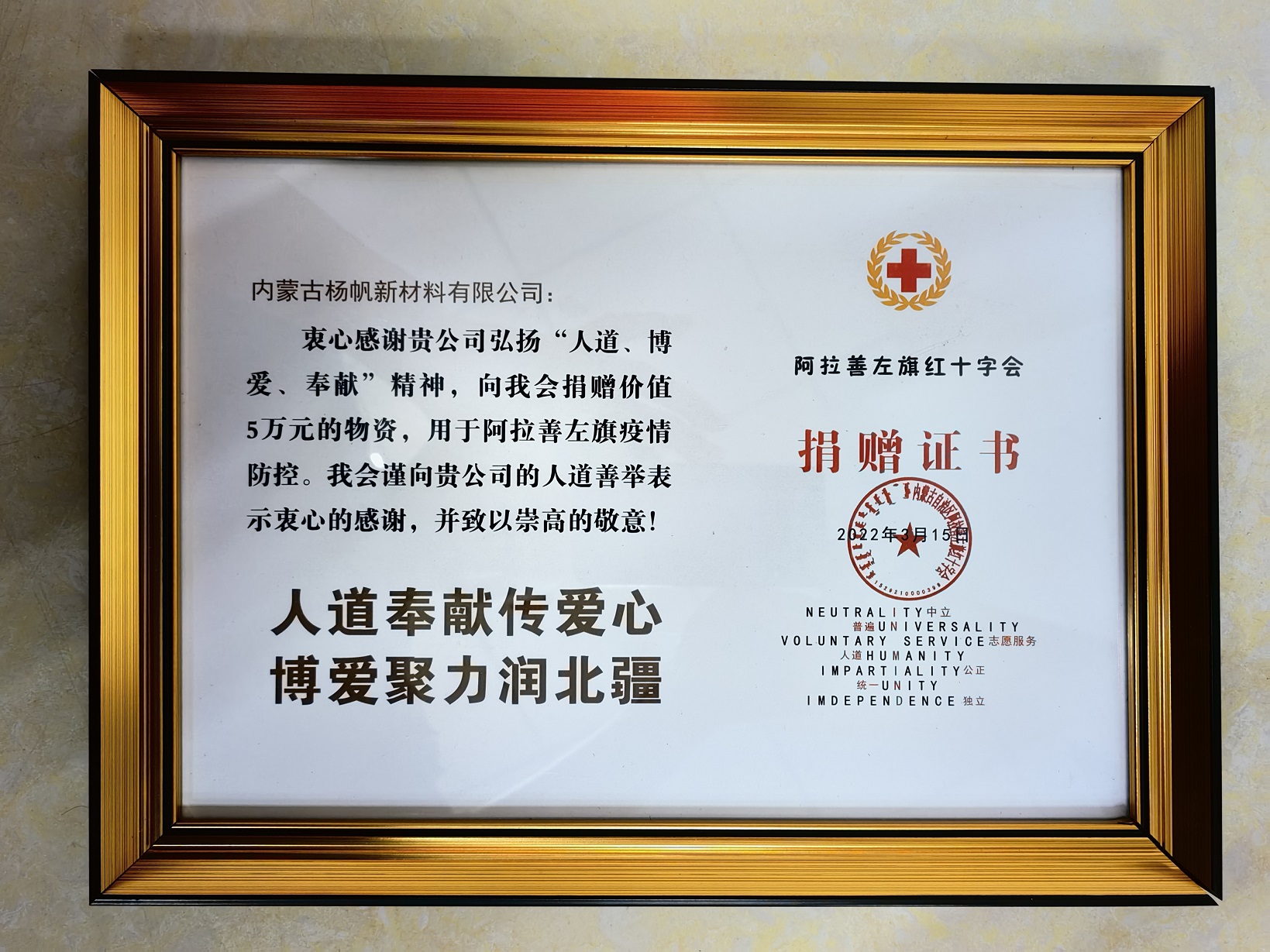 2022年4月份,位于內(nèi)蒙古阿拉善左旗最南部的溫都爾勒?qǐng)D鎮(zhèn)突發(fā)疫情,該鎮(zhèn)位于甘肅、寧夏和內(nèi)蒙古三省交界處,地理位置特殊,醫(yī)療和生活物資較為匱乏。內(nèi)蒙揚(yáng)帆在得到求援信息后,立即籌集資金協(xié)調(diào)車輛,連夜馳援400多公里,將價(jià)值5萬(wàn)余元的醫(yī)療和生活物資送至溫都爾勒?qǐng)D鎮(zhèn),及時(shí)緩解了疫情物資短缺的燃眉之急。此舉彰顯了揚(yáng)帆人積極服務(wù)社會(huì)、回報(bào)社會(huì)的擔(dān)當(dāng)精神,踐行了揚(yáng)帆新材“仁德創(chuàng)富 成己惠人”的核心價(jià)值觀。