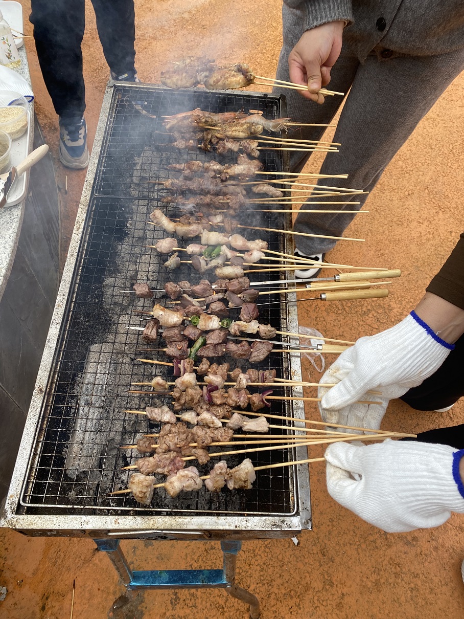 短暫休息后,開始下午的燒烤活動(dòng),大家自已動(dòng)手、分工合作:起火燒炭、擺桌串串、燒烤、分享食物……